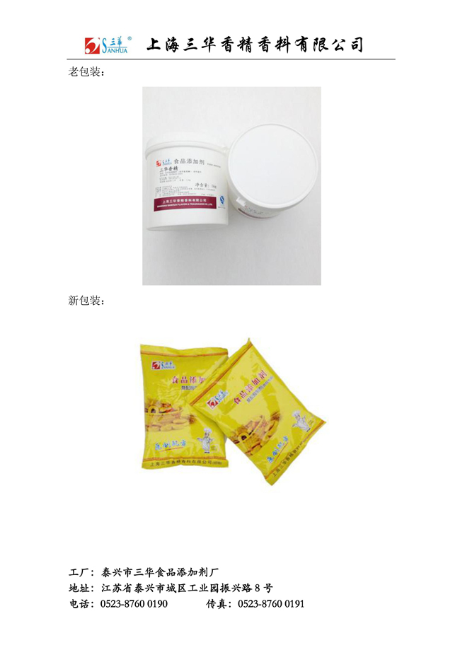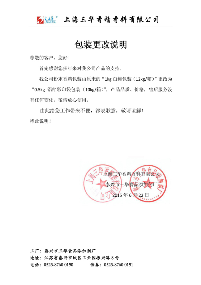 企业名称:上海三华香精香料有限公司生产地址:江苏省泰兴市城区工业园区振兴路8号电话:13901435803内贸部:0523-87600190传 真:0523-87600191 邮 箱:852391967@qq.com